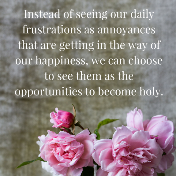 This is when that built-in sanctification comes in – if we will only accept it. Instead of seeing these frustrations as annoyances that are getting in the way of our happiness, we can choose to see them as the opportunities to become holy.