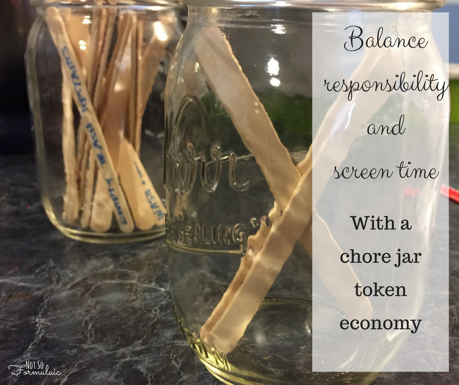 Short on time? Help your children learn to balance responsibilities and free time with a token economy chore jar. Write chores on popsicle sticks and put them in a mason jar. Children can choose a chore, complete it, and place the selected popsicle stick in a second mason jar. Kids earn free (or screen) time once all the sticks have been moved from one jar to another.