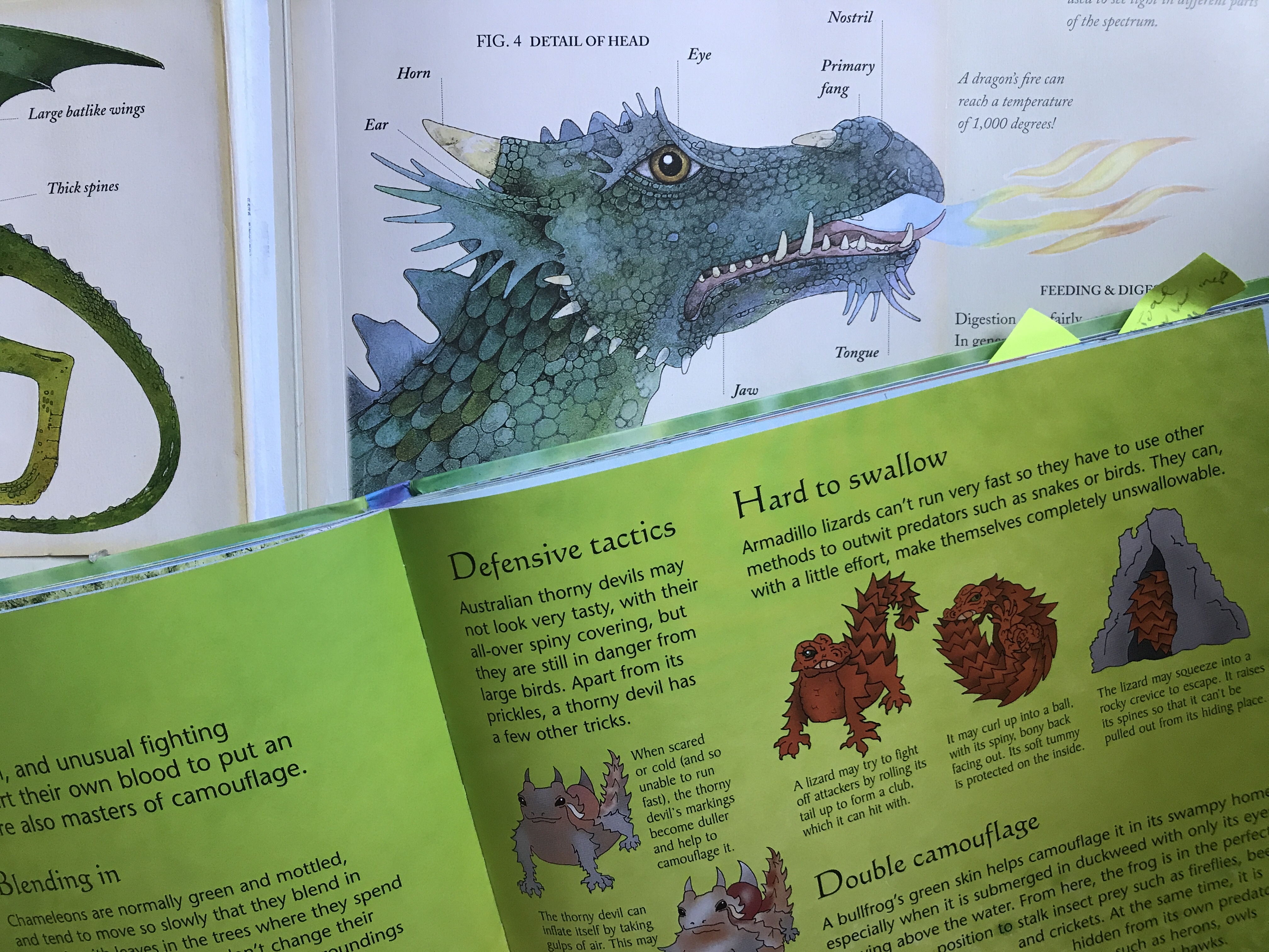 For my biology kiddo, Dragonology has been handy when it comes to reptilian anatomy. She’s been able to compare the characteristics of the Thorny Lizard with the scaly armor of a dragon.