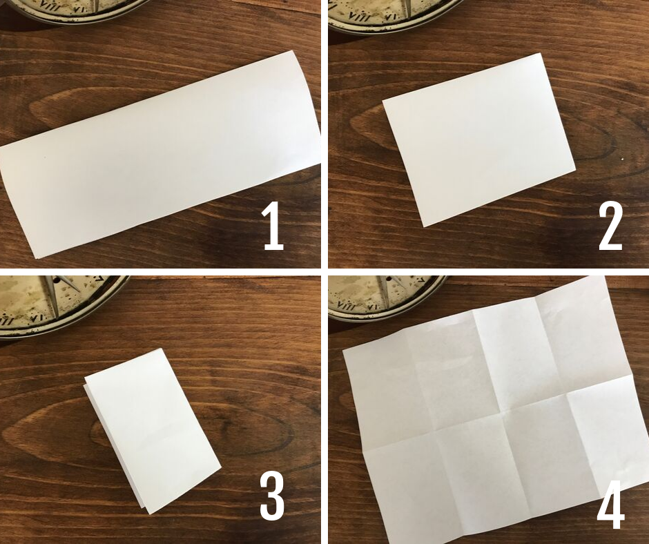 Divide a piece of paper into eight sections. Turn the paper to landscape orientation (horizontal) and fold top to bottom. Then fold right to left, and right to left once more. Unfold and spread out.
